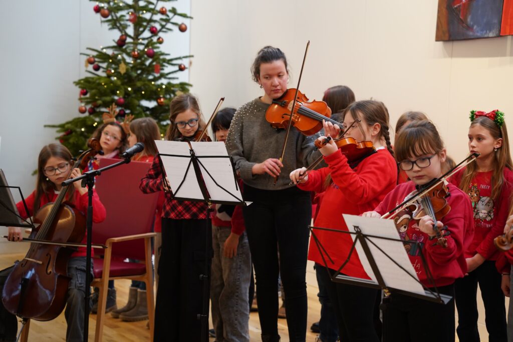 Die Kinder sangen gemeinsam einstudierte Weihnachts- und Adventslieder begleitet von Klavier und Streichinstrumenten. Manche Klassen hatten kleine Musikstücke eingeübt, andere trugen Gedichte vor oder gestalteten rhythmische Begleitungen.