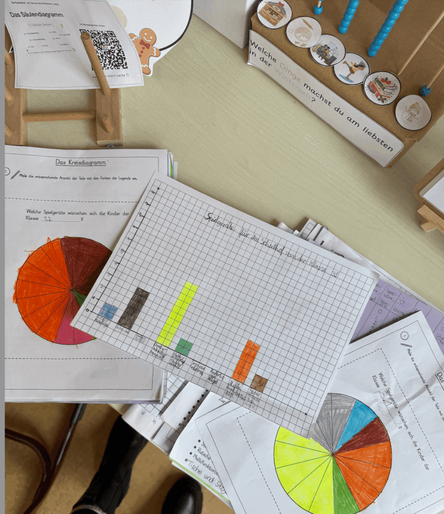 In den vergangenen Wochen wurde der Mathematikunterricht der Klasse 4.1 zu einem besonders praxisnahen Erlebnis. Gemeinsam mit Frau Angnes arbeiteten die Kinder an einem Thema, das ihnen aus ihrem Alltag vertraut ist. Daten und Diagramme, wie sie uns in Zeitungen, im Internet oder im Fernsehen täglich begegnen. Dabei zeigten die Schülerinnen und Schüler eindrucksvoll, dass Mathematik nicht nur verstanden, sondern auch aktiv erlebt werden kann.